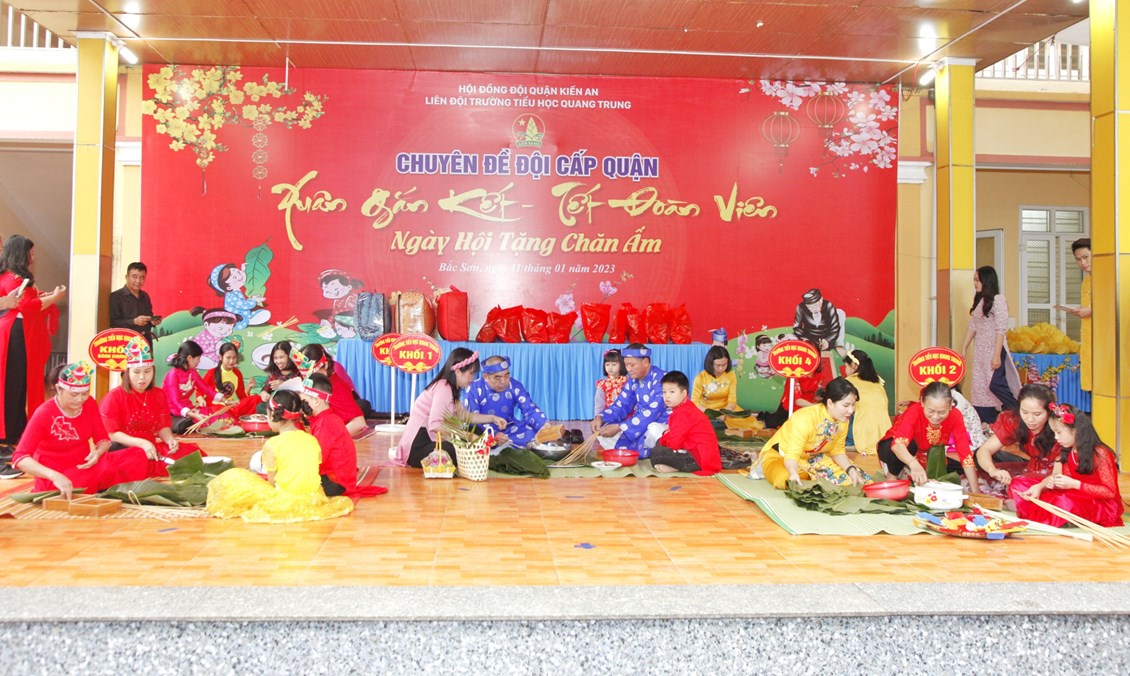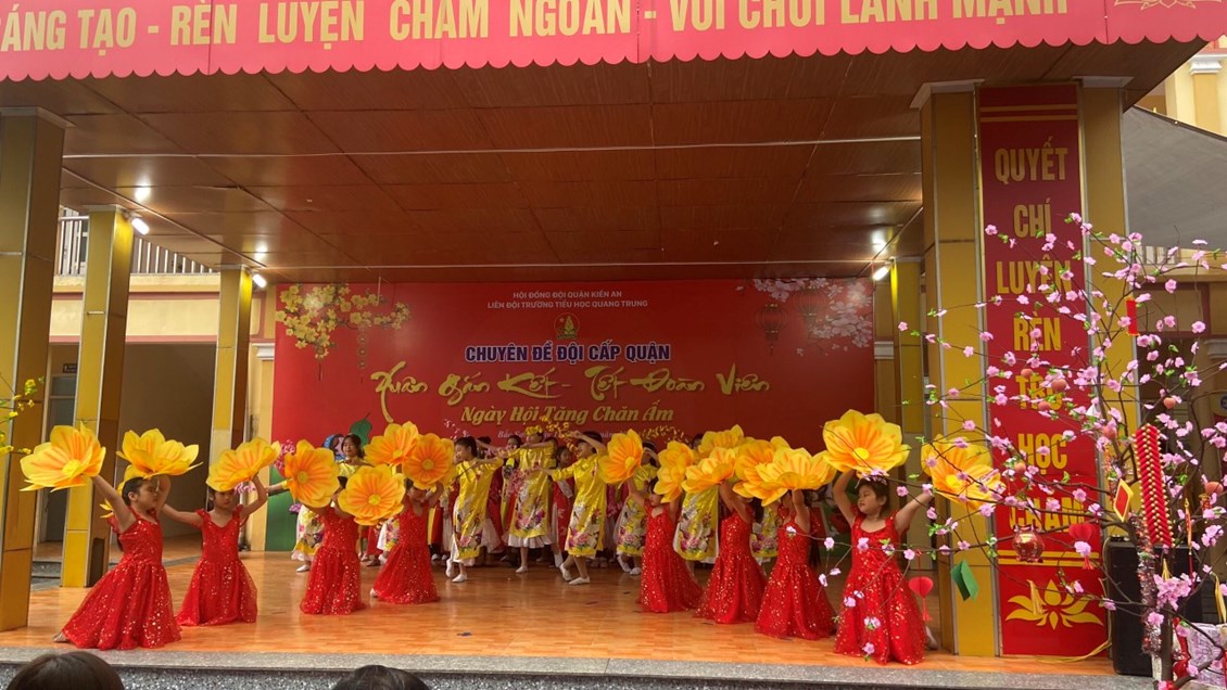 Trong chuyên đề “Xuân gắn kết - Tết đoàn viên” Liên đội trường TH Quang Trung đã mang đến những ca khúc vui tươi chào Xuân Quý Mão. Trong chuyên đề này, các em đã được tìm hiểu về những phong tục của ngày Tết cổ truyền. Điều đặc biệt hơn các em đã tái hiện lại hoạt cảnh Sự tích Bánh chưng bánh giày mang đậm tính văn hoá, dân tộc.