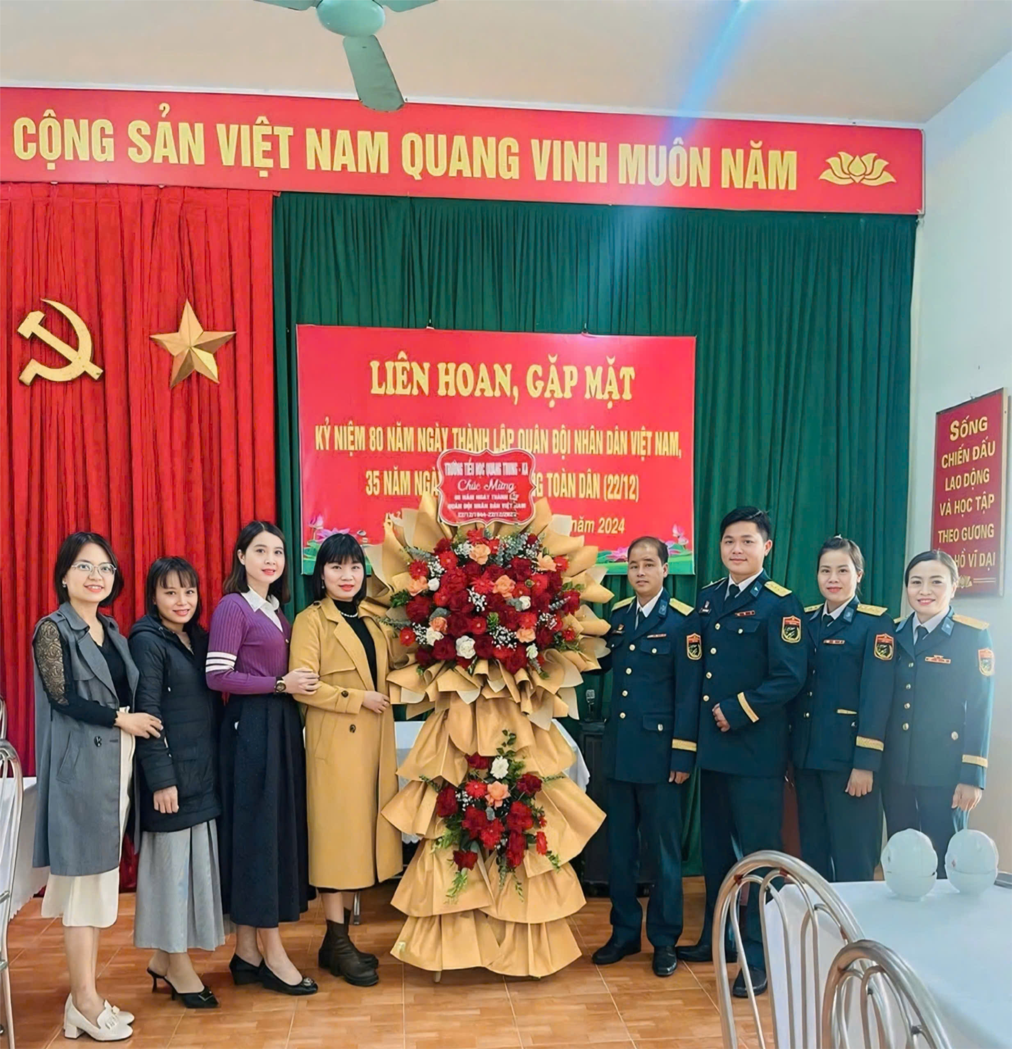 Trong chuỗi các hoạt động chào mừng 80 năm Ngày thành lập QĐND Việt Nam và 35 năm Ngày hội Quốc phòng toàn dân, nổi bật, ngày 19/12 Ban Giám hiệu nhà trường cùng Ban chấp hành Công đoàn, Đoàn Thanh niên đã đến tặng hoa chúc mừng các đồng chí tại Đại đội 9 Công Binh thuộc Sư đoàn 363. Các thầy cô đã có buổi nói chuyện rất vui vẻ, thân thiện với các đồng chí trong Đại đội 9, càng hiểu rõ hơn về công việc của những chiến sĩ công binh.