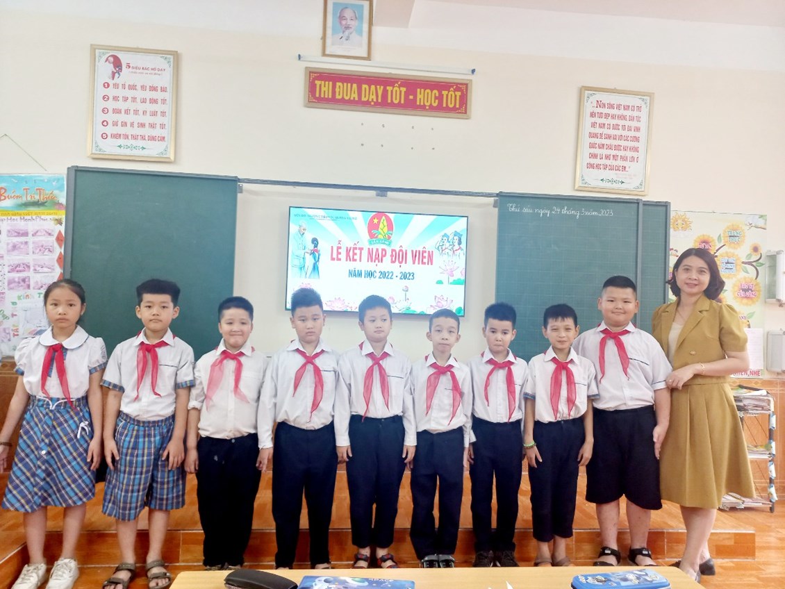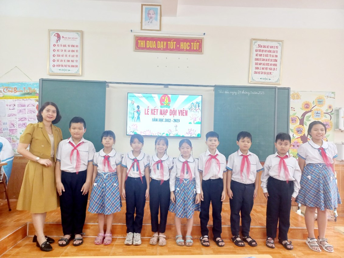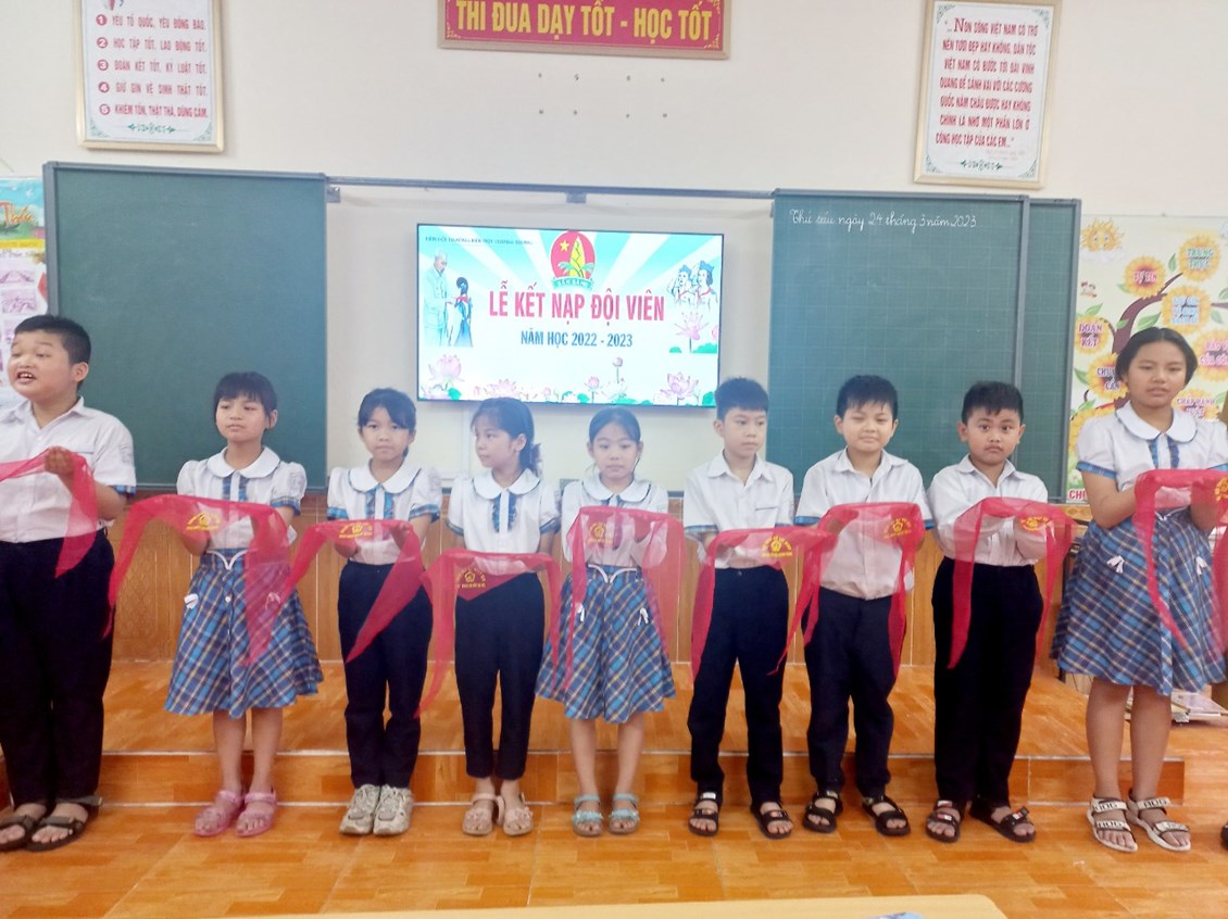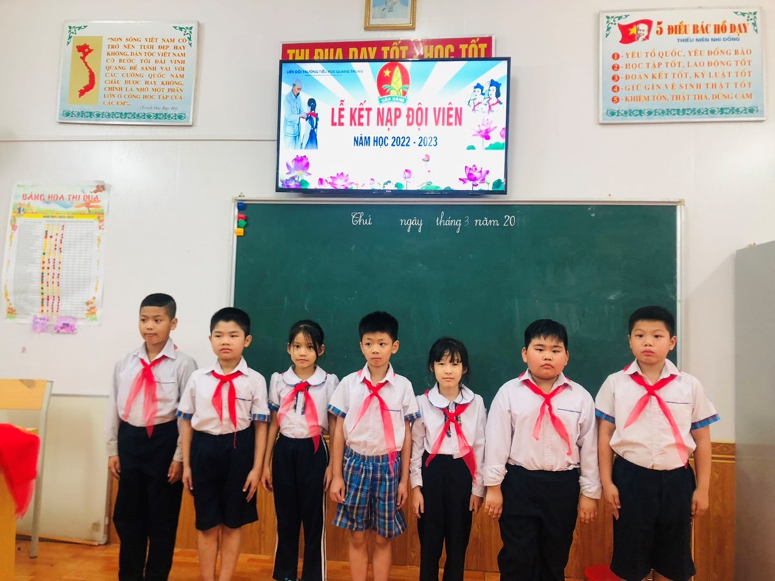 Nhân dịp kỷ niệm 92 năm ngày thành lập Đoàn TNCS Hồ Chí Minh (26/3/1931-26/3/2023). Chiều ngày 24/3 Liên đội trường tiểu học Quang Trung, đã tổ chức lễ kết nạp đội viên cho các em Nhi đồng khối lớp 3 (đợt 2), năm học 2022-2023. Các em được kết nạp đội viên hôm nay đều là những Nhi đồng chăm ngoan, có thành tích học tập tốt và tích cực tham gia phong trào, hoạt động của nhà trường.