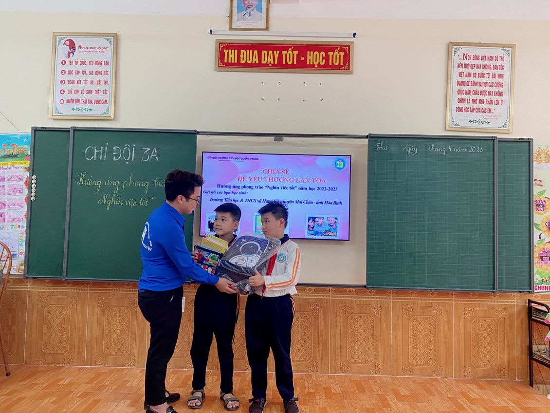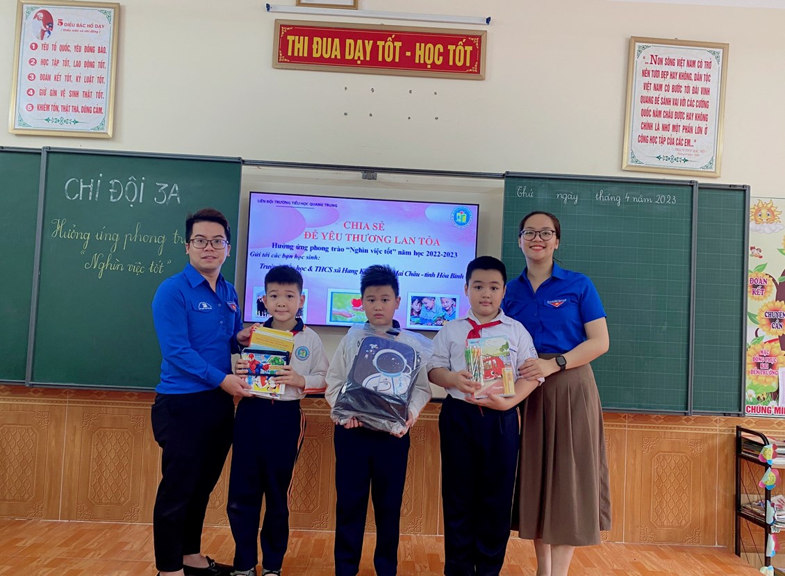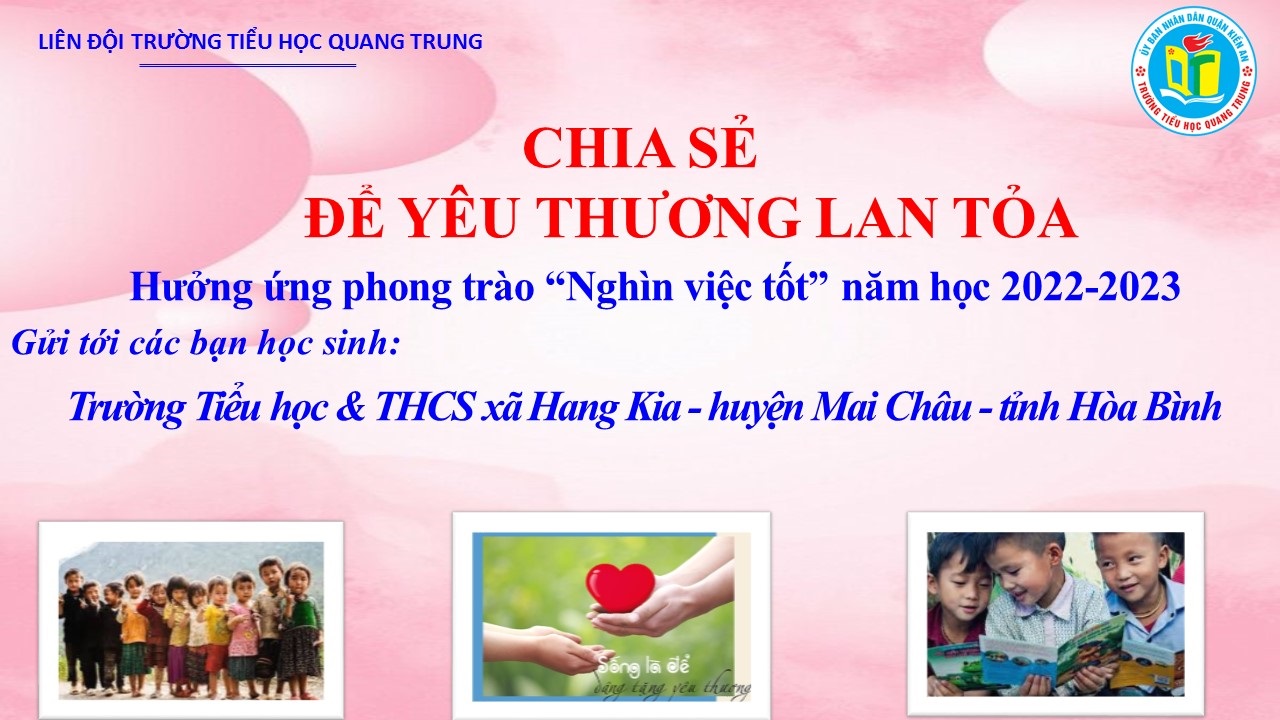 Hưởng ứng phong trào “Nghìn việc tốt” trong 4 ngày từ ngày 10/4 đến ngày 14/4/2022 Hoạt động kêu gọi ủng hộ đồ dùng học tập, sách, vở để giúp đỡ các bạn học sinh nghèo ở trường TH & THCS Hang Kia – huyện Mai Châu – tỉnh Hoà Bình đã diễn ra sôi nổi trong toàn liên đội.