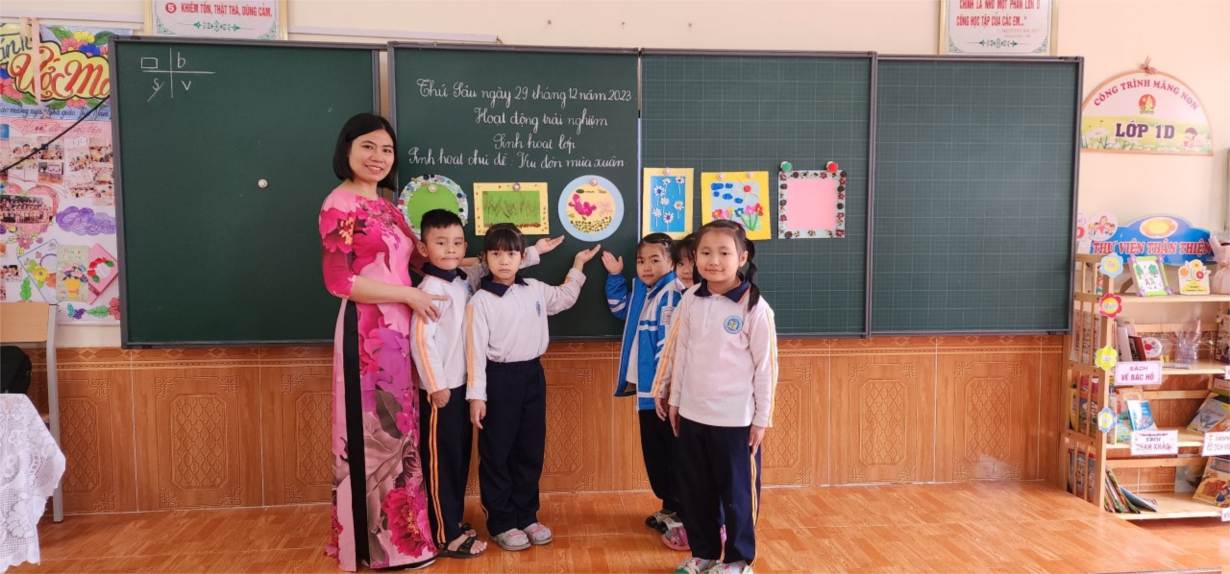 Tiết dạy do cô giáo Nguyễn Thị Thúy Liễu cùng các em học sinh lớp 1 D thực hiện. Tiết dạy đã bám sát mục tiêu của chuyên đề, lồng ghép chủ đề 2- Ngày Tết quê em và lồng ghép Giáo dục STEM. Từ những nguyên liệu như: giấy màu, bông tăm, đất nặn, lá cây, cỏ khô, hoa giấy, cúc áo và các loại hạt như: hạt gấc, đỗ đen, đỗ tương,.... Học sinh được trải nghiệm, sáng tạo tạo ra những khung tranh, tranh để làm quà tặng người thân, thầy cô giáo và bạn bè nhân dịp Tết đến, Xuân về. Nội dung bài dạy phù hợp với tác động tới các đối tượng, học sinh được rèn luyện sự tự tin được thử sức, được sáng tạo, được trình bày giới thiệu các sản phẩm của nhóm mình làm ra.