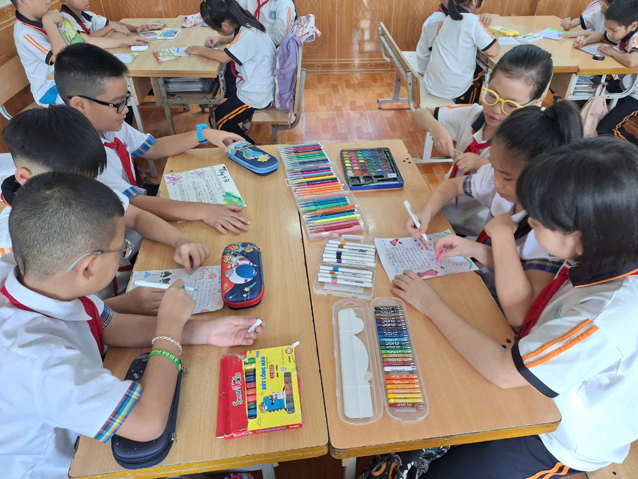 Tập thể học sinh lớp 4A rất hào hứng và tích cực tham gia. Các em được viết lên những cảm xúc, suy nghĩ và thể hiện lòng biết ơn, tri ân tới các thầy cô giáo đã dạy mình. Những bài viết thật mộc mạc, chân thật nhưng chứa đựng thật nhiều cảm xúc. Từ việc trang trí bảng đến việc trang trí những hình ảnh, họa tiết trên mỗi bài viết đều do chính tay các em thể hiện.