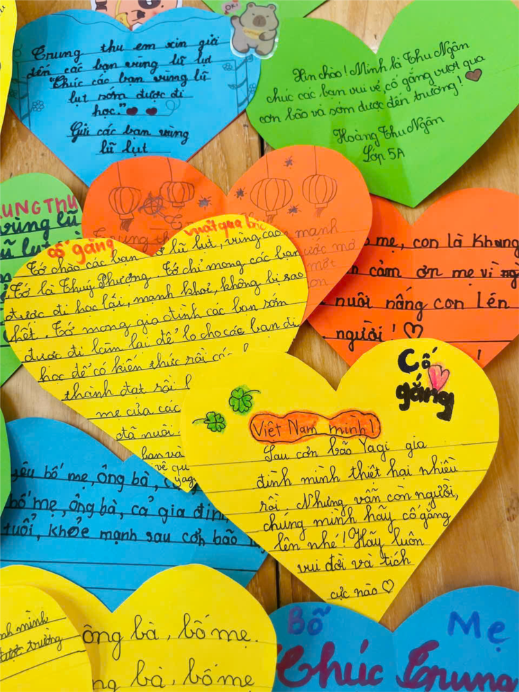 Năm nay, thay vì chuẩn bị mâm cỗ, hát múa, xem lân, chúng tớ cùng nhau viết những bức thư, những tấm thiệp gửi các bạn vùng lũ phía Bắc. Chúng tớ cũng vừa trải qua cơ bão số 3 có tên là Yagi, một cơn bão khủng khiếp đã lật tung bao mái nhà, trường học, nhà thì ngập lụt, hàng ngàn cây đổ. Những cây cổ thụ lâu năm có đến gần trăm tuổi cũng bị bật gốc bởi sự tàn khốc của Yagi mang lại. Những vườn hoa trung tâm thành phố được ví là lá phổi xanh bị đổ nghiêng ngả…Nếu kể ra thì còn rất nhiều rất nhiều nữa. Và chính vì vậy, chúng tớ càng hiểu hơn sự mất mát của trận lũ lịch sử đổ về phía các bạn. Tớ thấy có rất nhiều người mất người thân, mất cả nhà cửa, rồi ngay cả những bạn độ tuổi chúng tớ cũng ra đi mãi mãi… Thương tâm, xót xa quá.