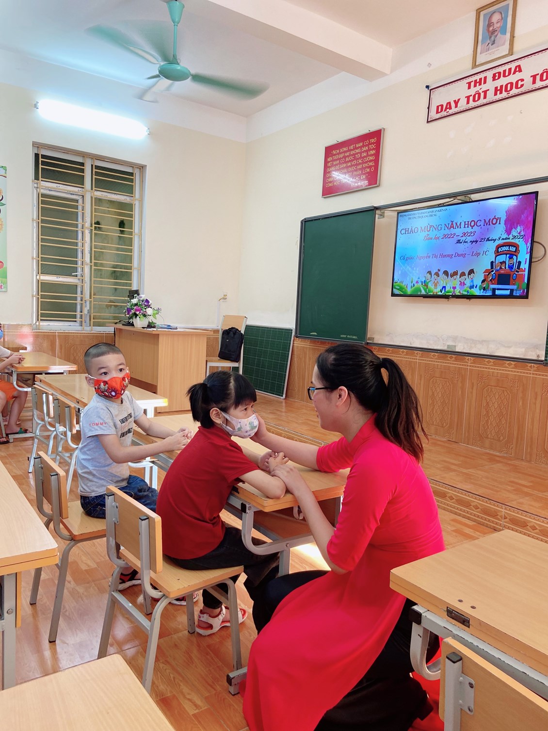 Về phía Trường tiểu học Quang Trung, các thầy giáo, cô giáo cũng đã đến sớm để chờ đón học sinh. Khi vào cổng trường, học sinh sẽ được các cô đón và đưa tận đến cửa lớp học giao cho cô giáo chủ nhiệm.